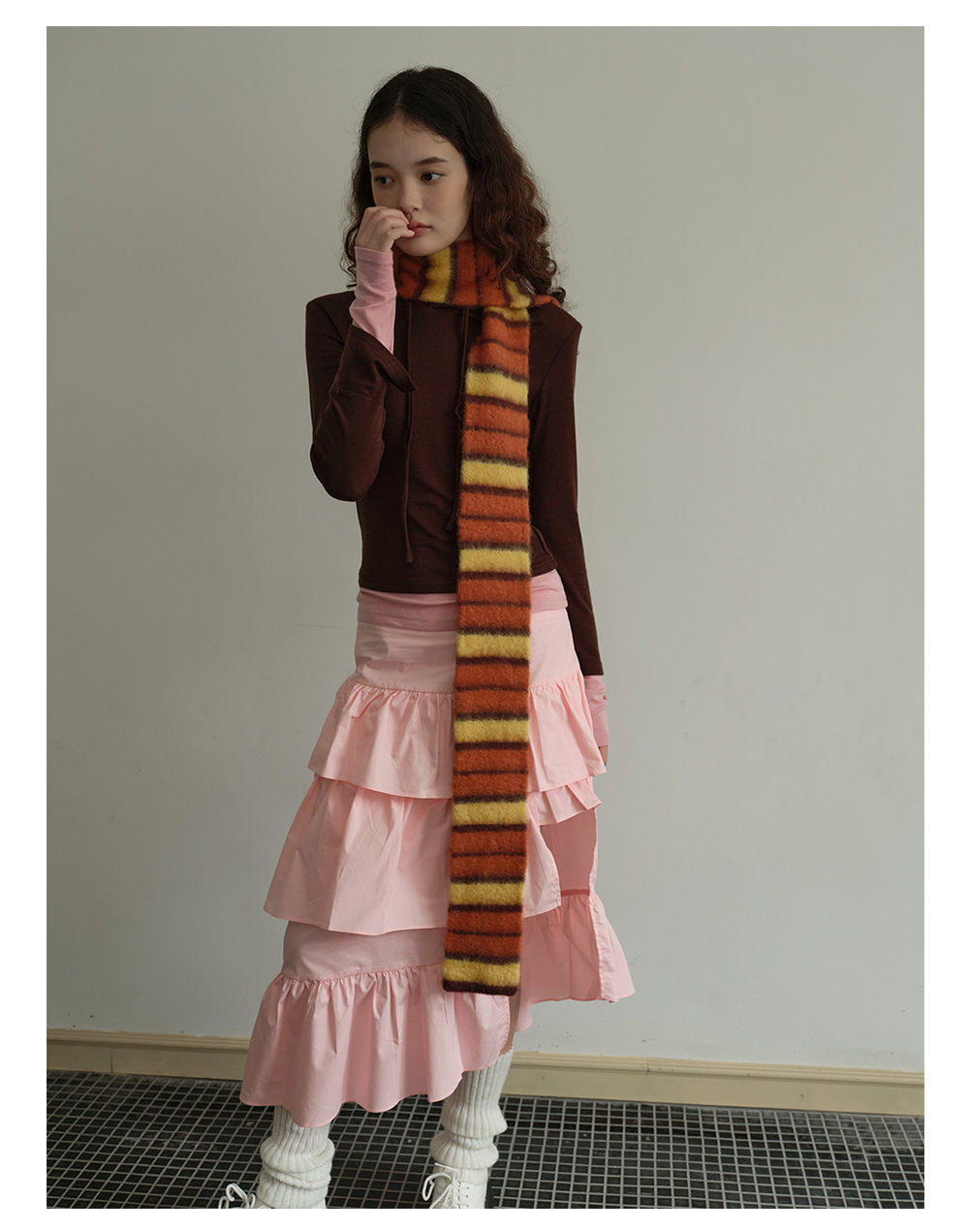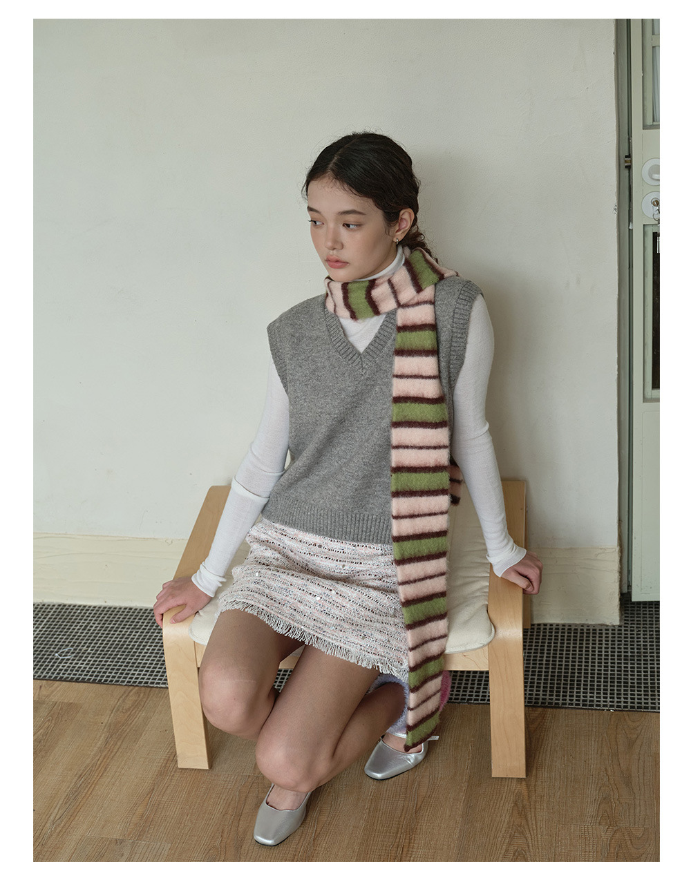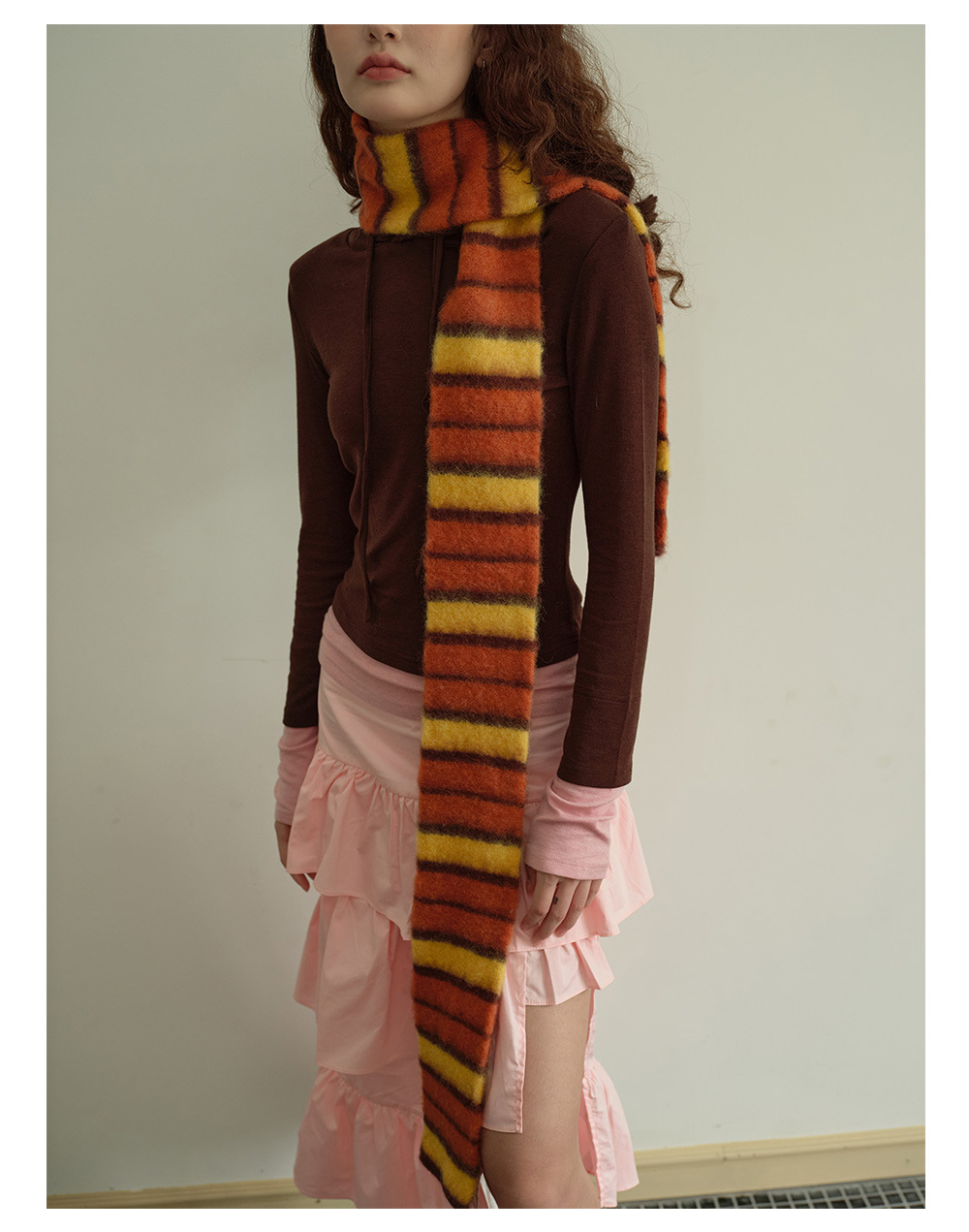 Designer thin and narrow contrasting stripes knitted small scarf women's autumn and winter concave double-layer warm wool scarf