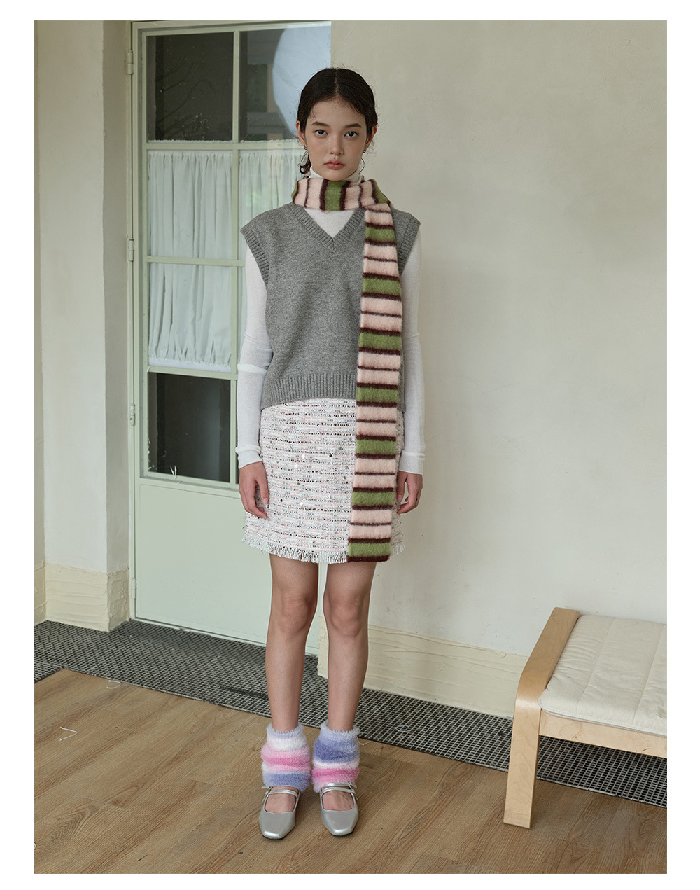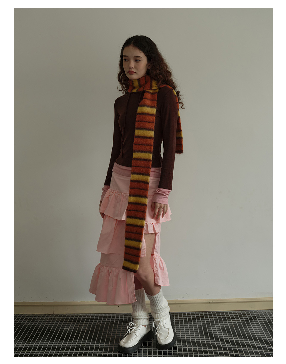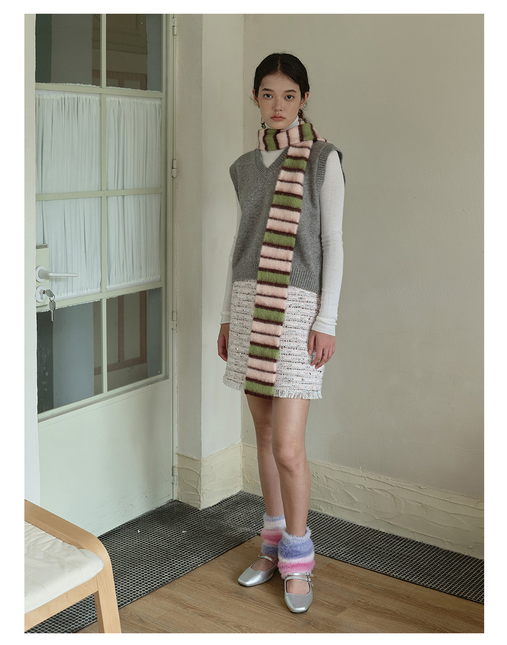Designer thin and narrow contrasting stripes knitted small scarf women's autumn and winter concave double-layer warm wool scarf