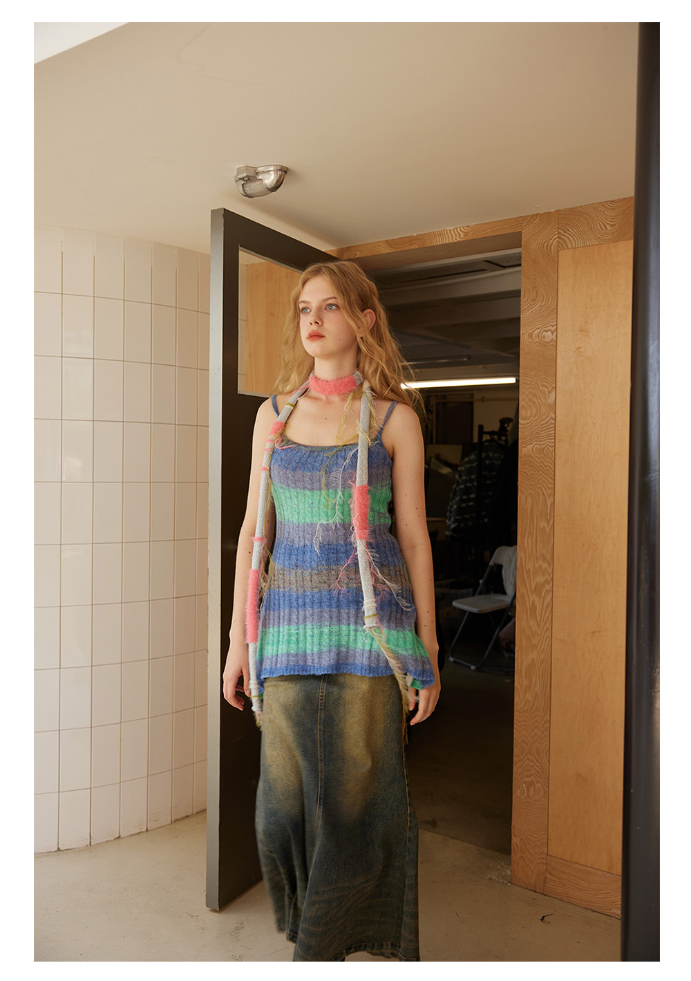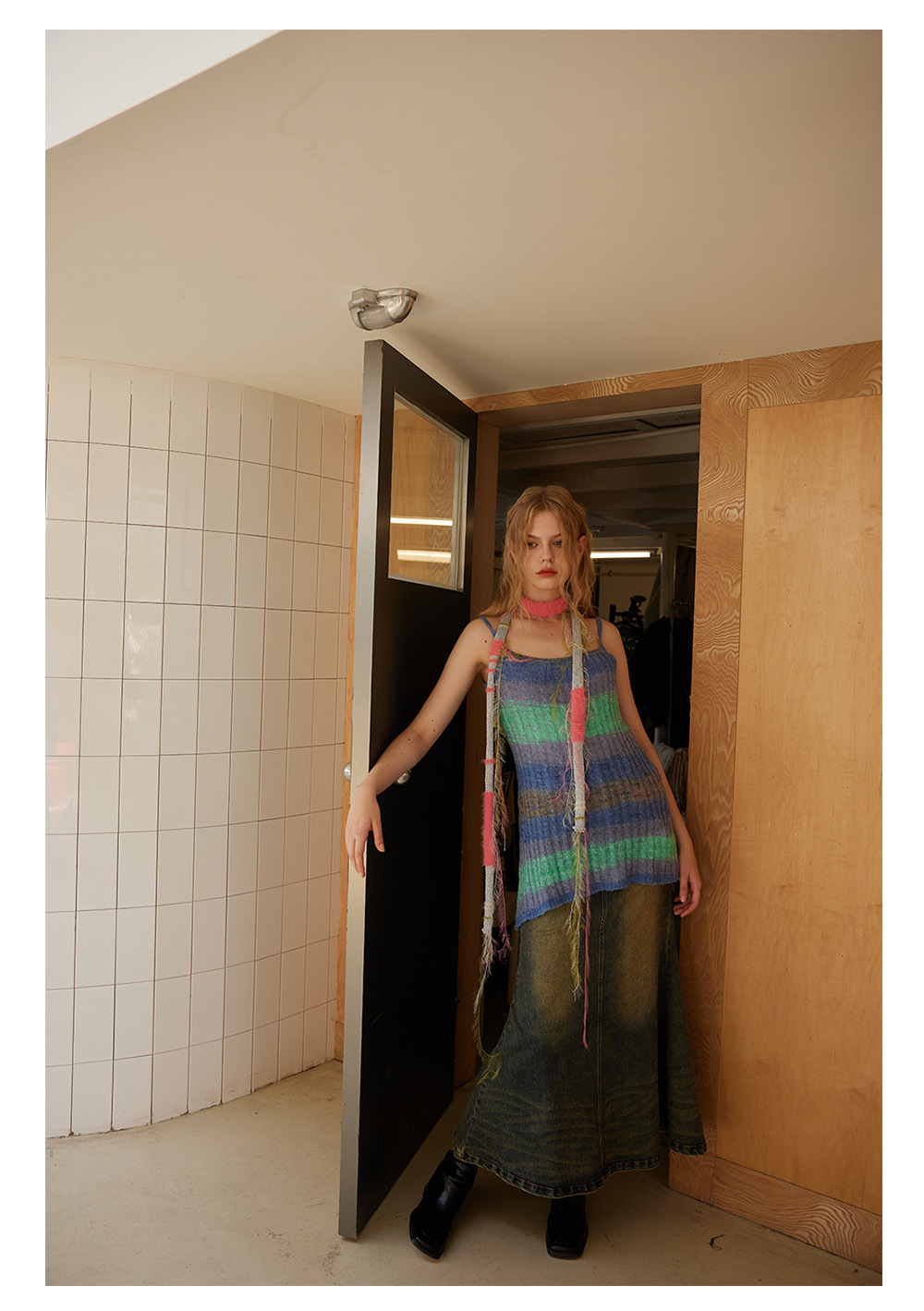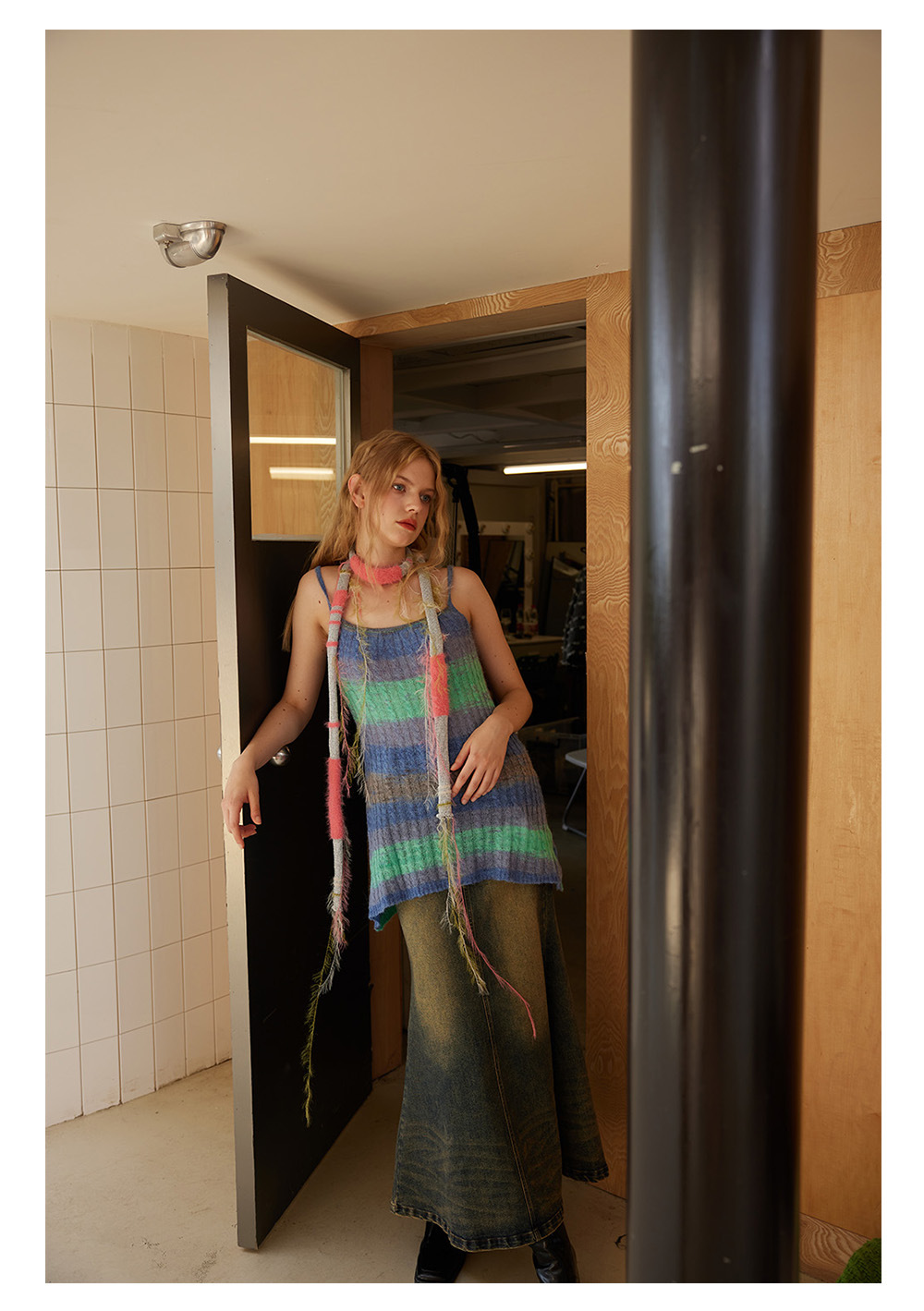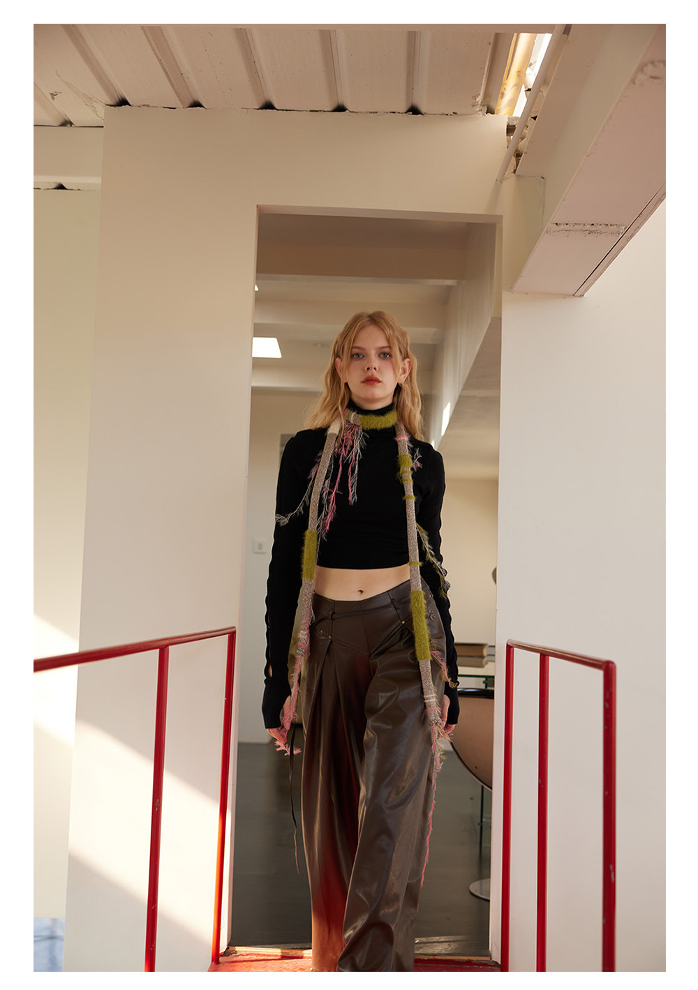 Niche broken retro mixed color hanging beard bright silk scarf scarf female slender shape dark wind JK fringed scarf