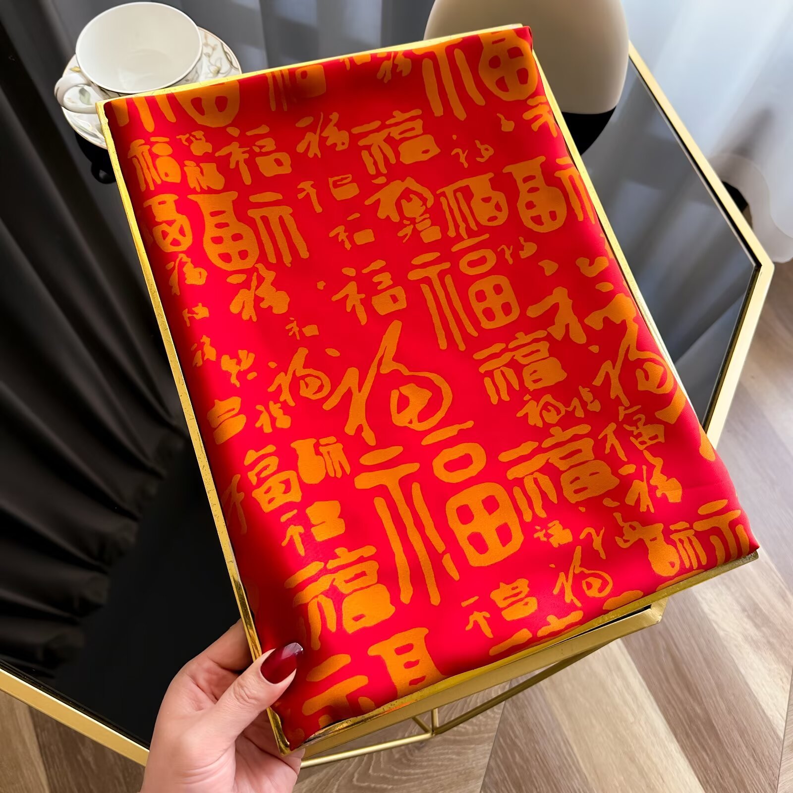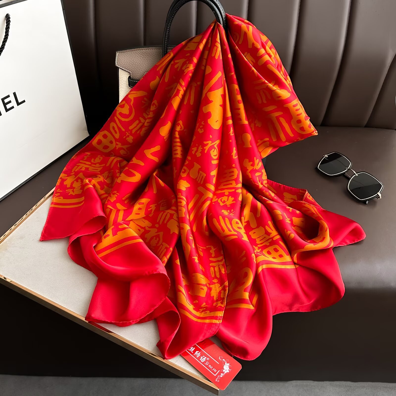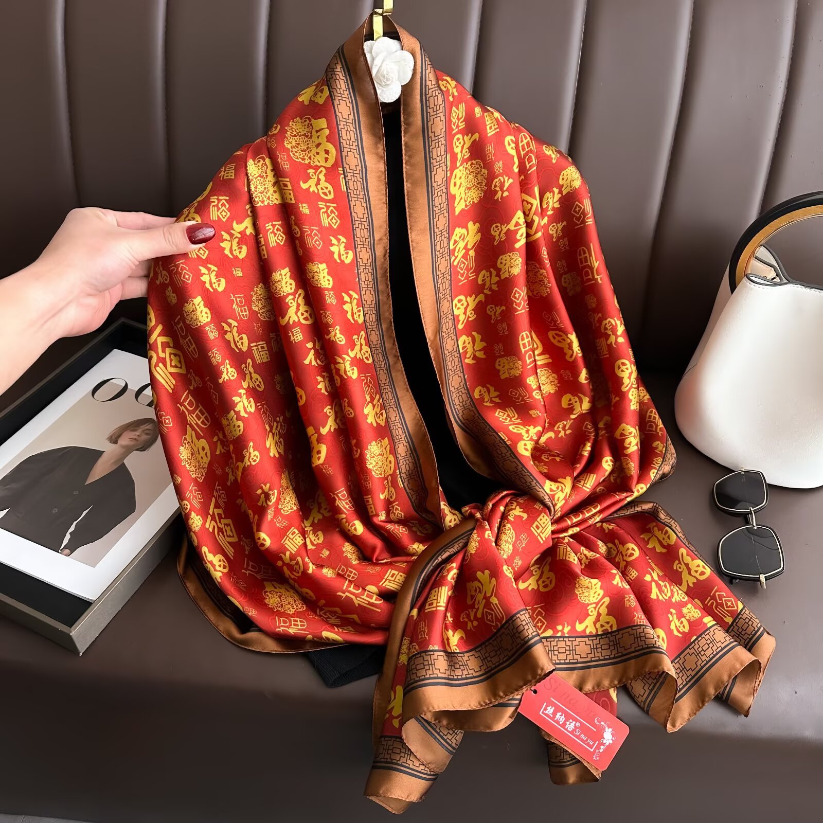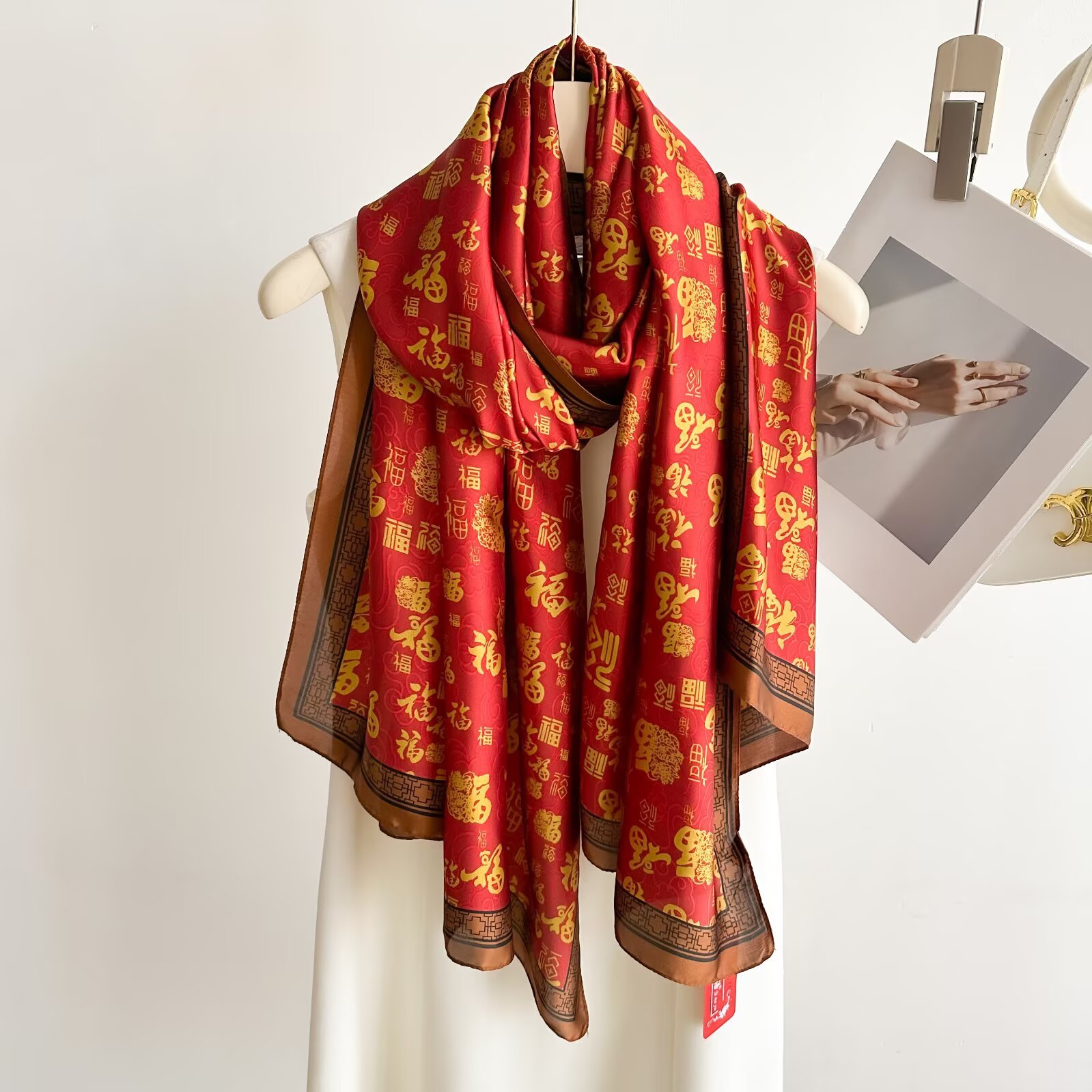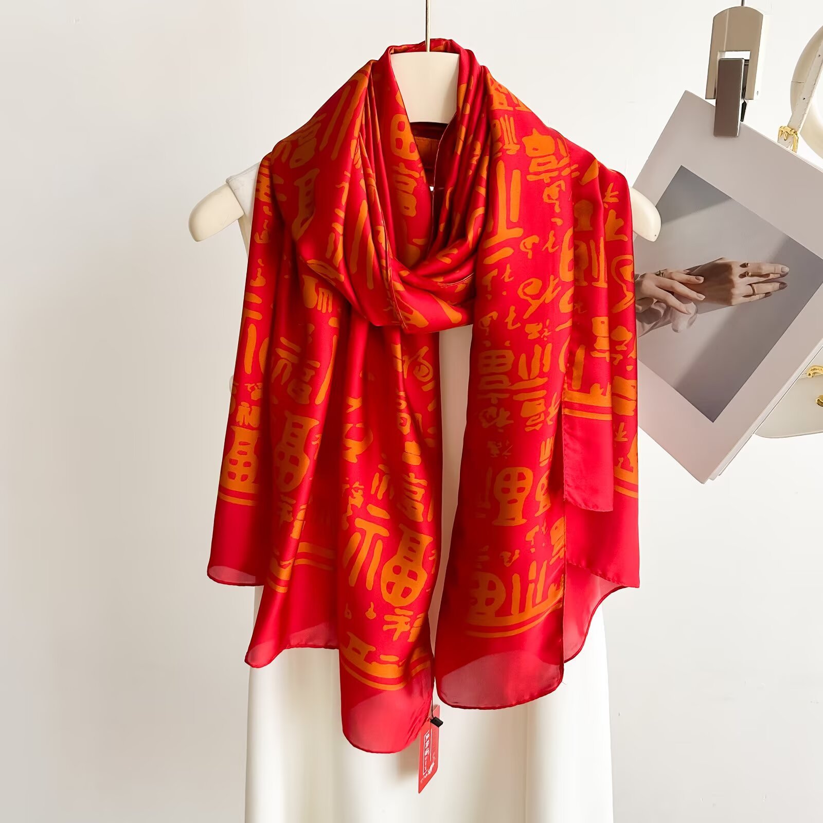 Retro ethnic style blessing character printing long silk scarf, simple and elegant temperament women's outer shawl, hand-in-hand gift silk scarf